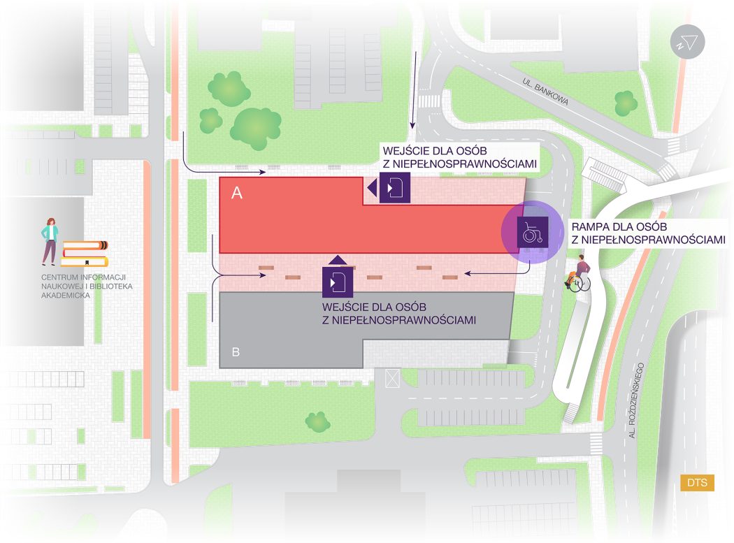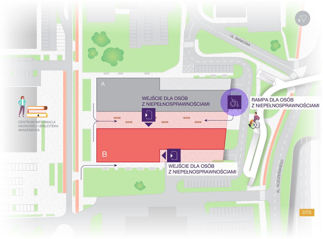 Na parterze i na każdym piętrze budynku znajdziesz toaletę dla osób z niepełnosprawnościami. Każda winda jest przystosowana do transportu osób z niepełnosprawnościami i informuje o piętrze sygnałem dźwiękowym. Posiada również komplet informacji zapisanych alfabetem Braille’a.