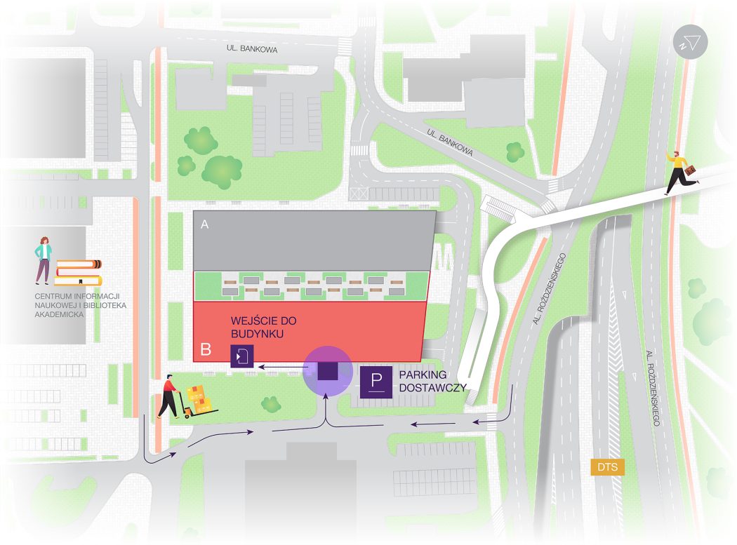 Kurierów z paczkami, które nie wymagają korzystania z wózka, zapraszamy wejściem głównym lub wejściem od strony pasażu.