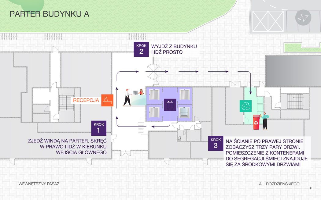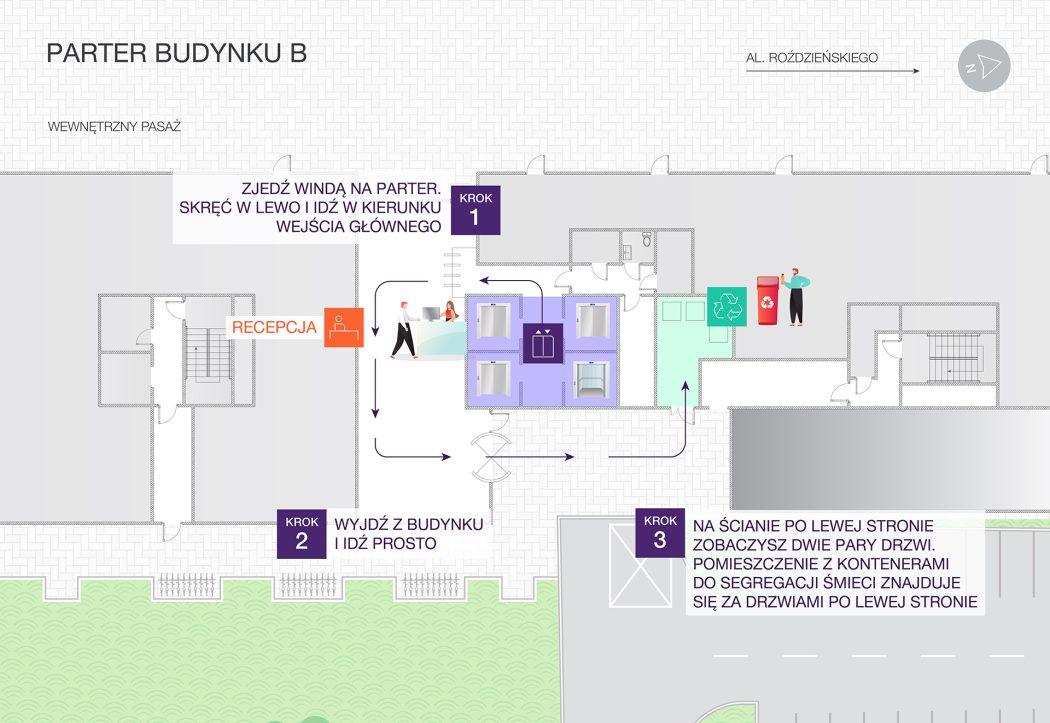 Stawiamy na ekologiczne rozwiązania i takiego podejścia oczekujemy też od Ciebie – prosimy o sortowanie odpadów zgodnie z obowiązującymi wytycznymi. Gdzie je wyrzucać? Kontenery na śmieci czekają w specjalnie wydzielonym pomieszczeniu na parterze budynku. By do niego trafić, skorzystaj z planu poniżej.
